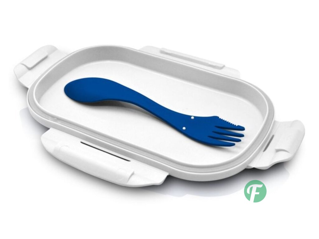 Oficiální produkt - svačinový box s vidličkou z katalogu výrobků s grafikou a licencí populárního fotbalového týmu FC Real Madrid.