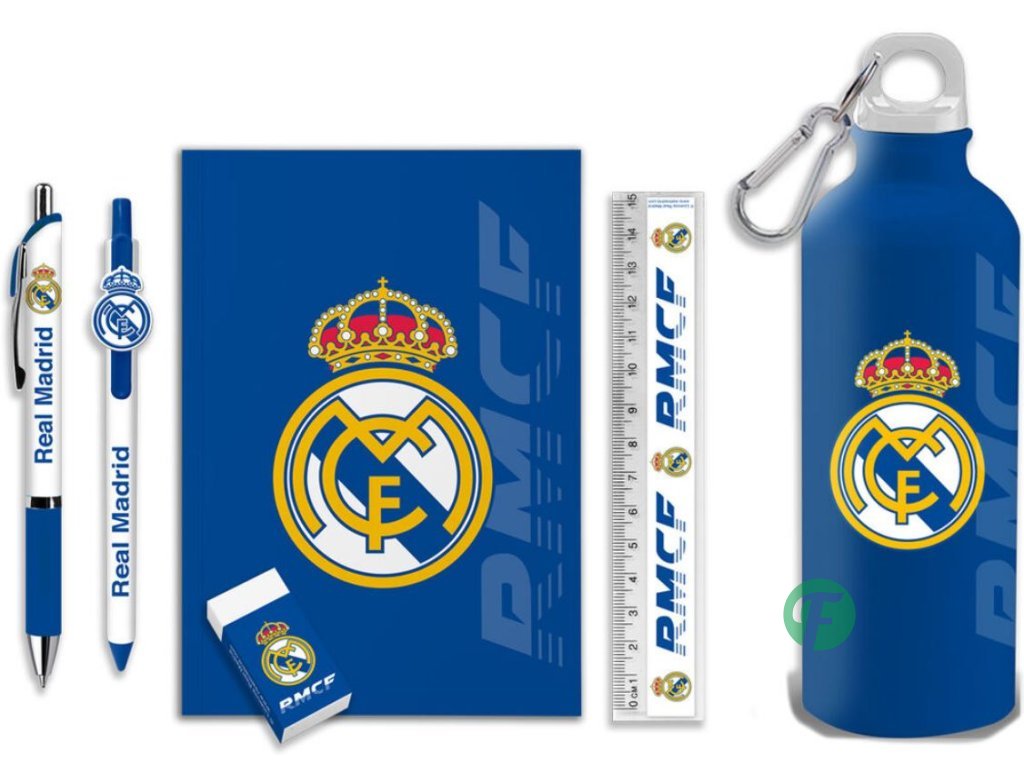 Součástí sady je sešit, propiska, tužka, guma, pravítko a láhev na pití, vše v motivu Real Madrid FC.